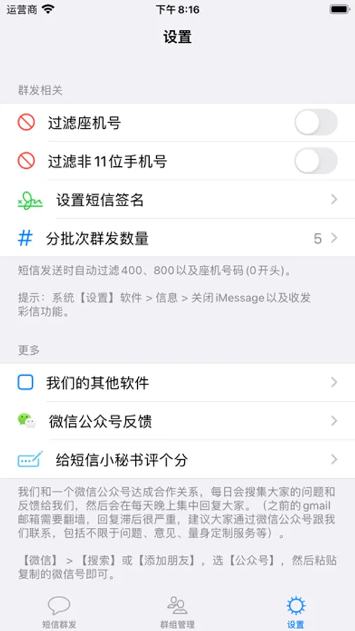 • 自动分组循环功能有效的避免了群发短信的可能导致的卡顿现象以及运营商垃圾短信监管机制
