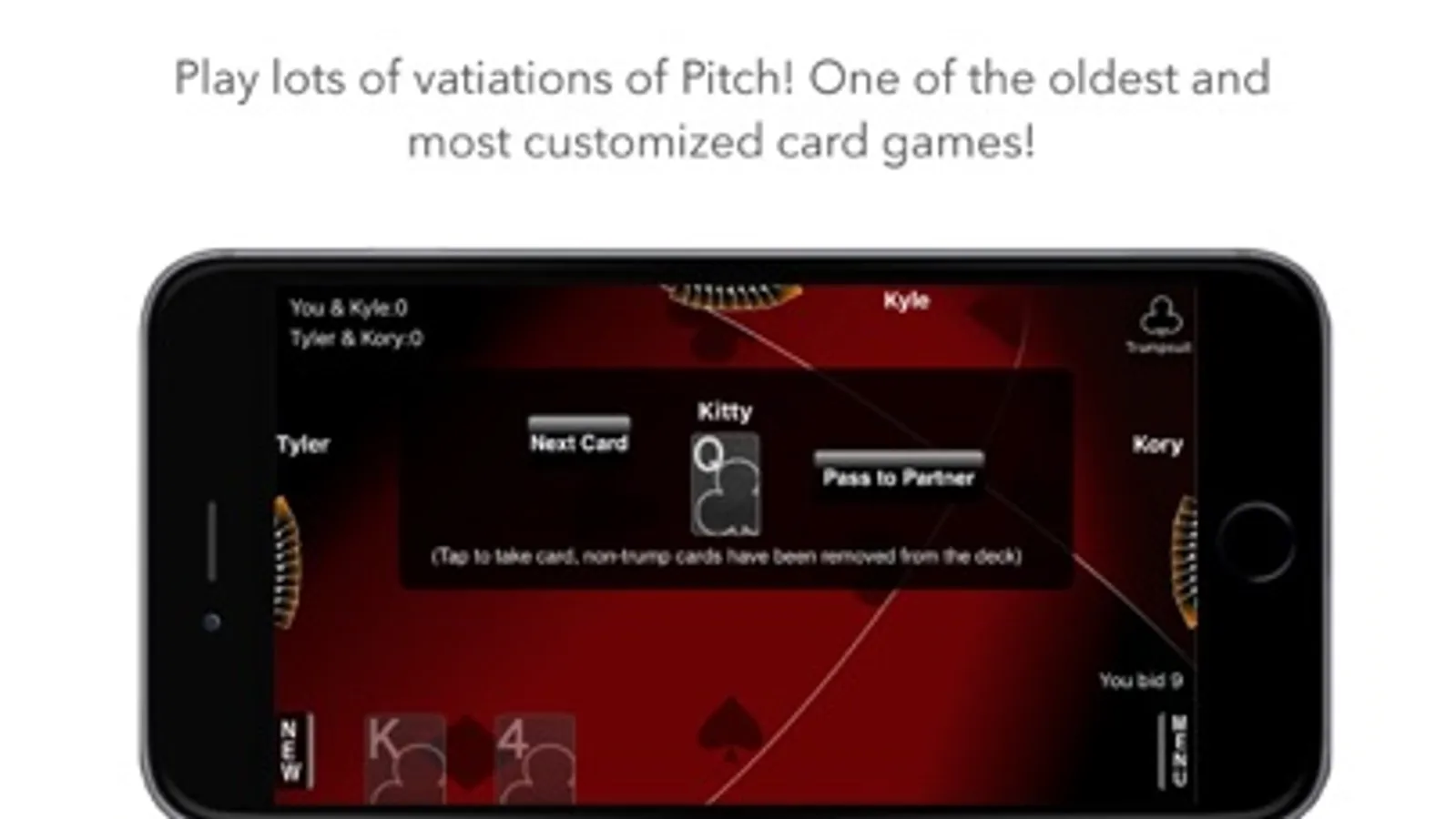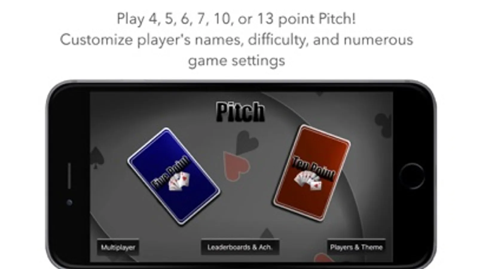 You can play 4, 5, 6, 7, 10, or 13 point Pitch! Customize player's names, personalities, winning conditions, options to keep low, pass the kitty and many more.