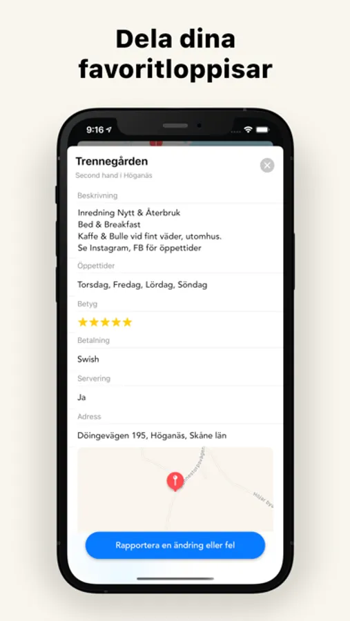• Betygsätt de butiker du besöker för att hjälpa andra på deras loppisresa.
