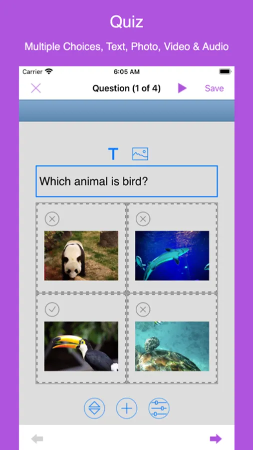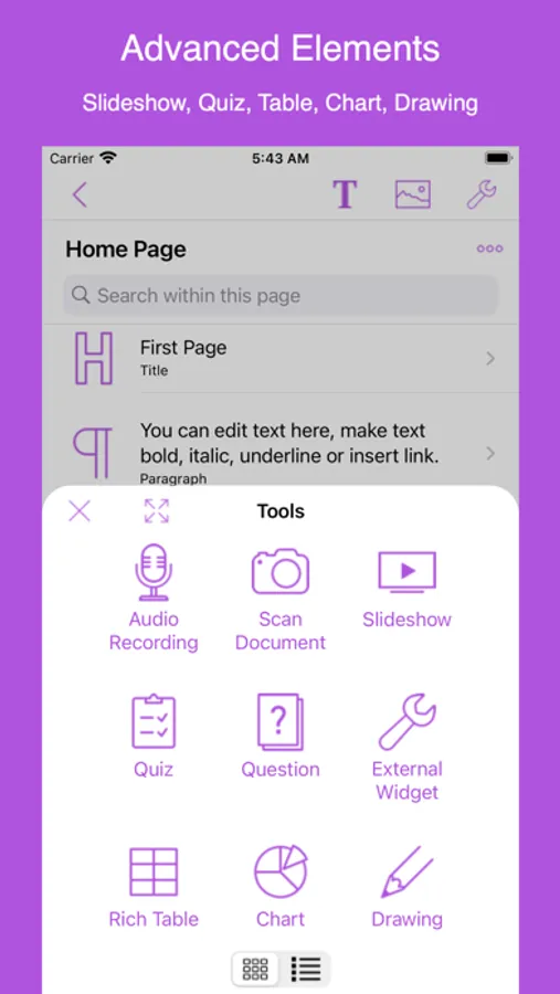* Insert title, paragraph, images, videos, links, gallery, list, HTML, table, audio recording, music, question, equation(LaTeX), embed html, iframe and map