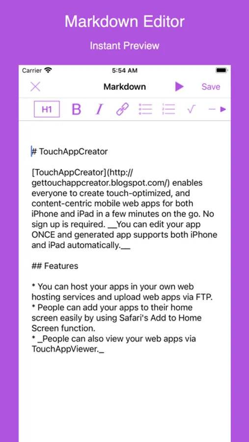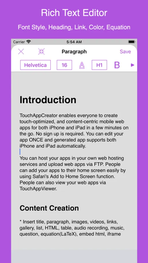 TouchAppCreator enables everyone to create touch-optimized, and content-centric mobile web apps for both iPhone and iPad in a few minutes on the go. No sign up is required. You can edit your app ONCE and generated app supports both iPhone and iPad automatically.