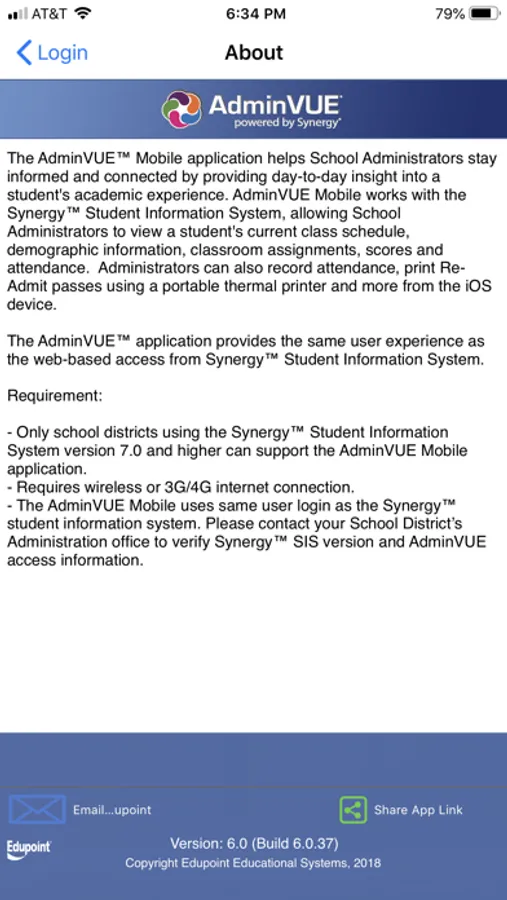· The AdminVUE Mobile app uses same user login as the Synergy™ student information system. Please contact your School District’s Administration office to verify Synergy™ version and AdminVUE access information.