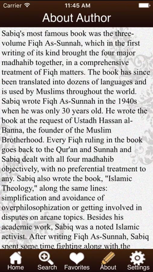 Sabiq wrote Fiqh As-Sunnah in the 1940s when he was only 30 years old. He wrote the book at the request of Ustadh Hassan al-Banna, the founder of the Muslim Brotherhood. Every Fiqh ruling in the book goes back to the Qur'an and Sunnah and Sabiq dealt with all four madhahib objectively, with no preferential treatment to any. Sabiq also wrote the book, "Islamic Theology," along the same lines: simplification and avoidance of overphilosophization or getting involved in disputes on arcane topics. Besides his academic work, Sabiq was a noted Islamic activist. After writing Fiqh As-Sunnah, Sabiq spent some time fighting along with the Mujahideen in Palestine in the late 1940's and he later visited most countries in the world and lectured in their mosques. He was the first graduate of Azhar to visit the Soviet Union and check on the conditions of Muslims there. Sabiq was born in 1915 in the Egyptian village, Istanha. He received his education at Al-Azhar and after his graduation worked as the Director of Mosques and Islamic Education in the Egyptian Islamic Affairs Ministry. He also taught at Al-Azhar, and later moved to Saudi Arabia, where he headed the Shari'a Graduate Studies Department in Um Al-Qura University. After moving back to Egypt, he spent years teaching students in a Mosque in Cairo.