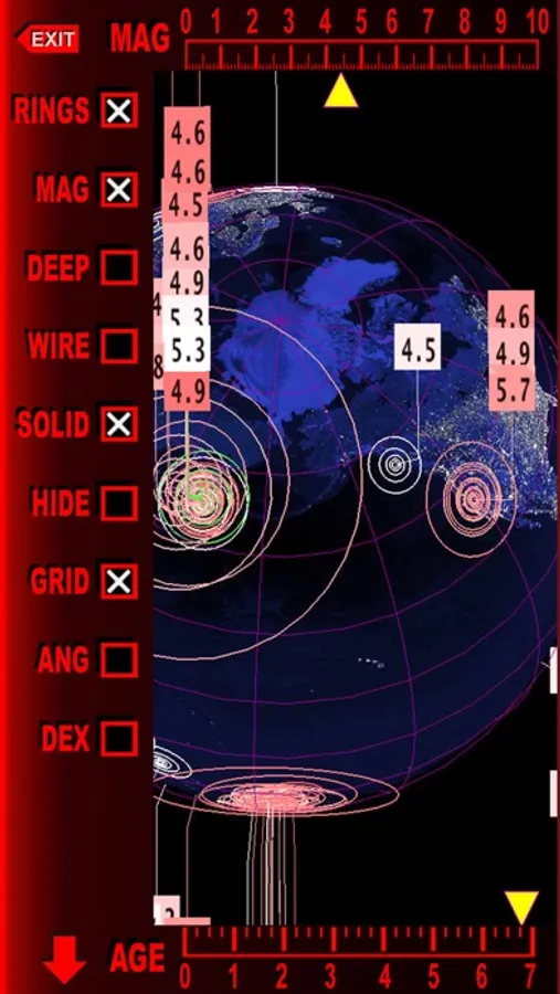 - Individual quake indicator 'flags' that show magnitude or depth.