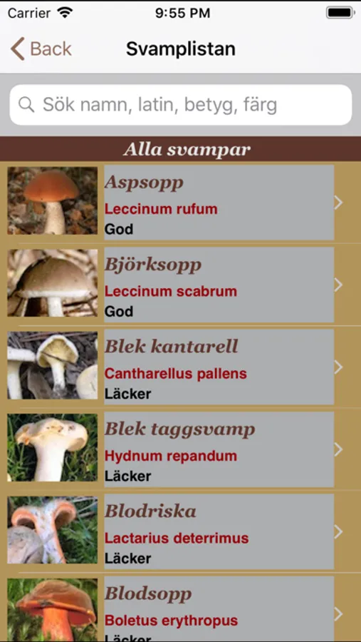 Sökning möjlig i listan vad avser svenskt och latinskt namn, betyg och färg.