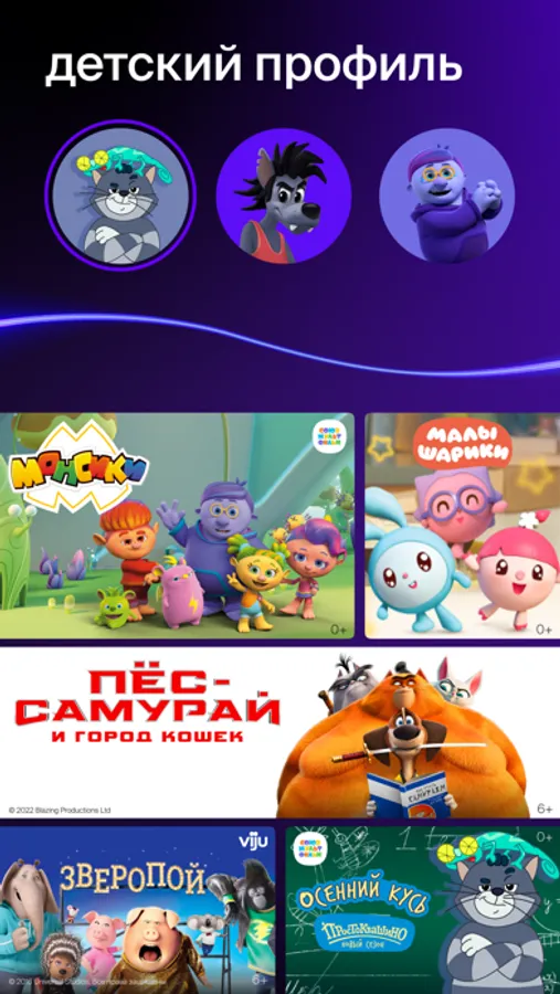 • Используйте детский профиль, чтобы оградить ребёнка от контента не по возрасту. Выбирайте самое интересное из тысяч мультфильмов и детских передач.