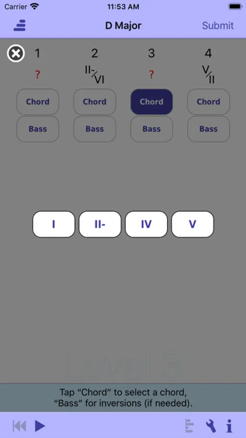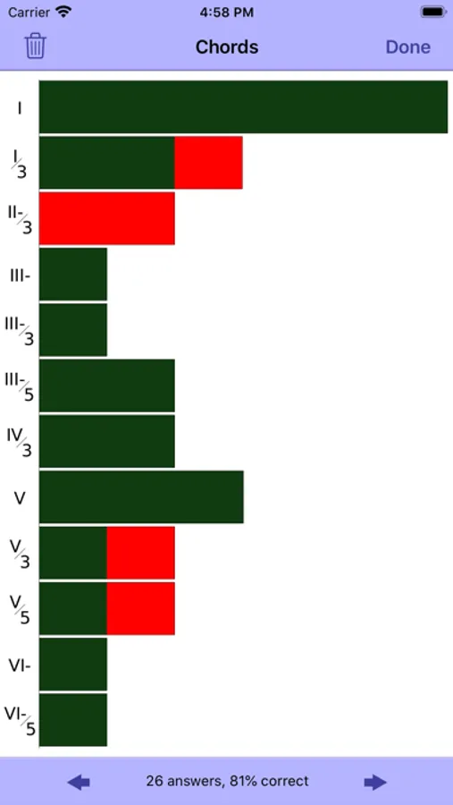 • Detailed statistics show how well you did on progressions, individual chords, chord qualities (types), chord roots and bass tones.