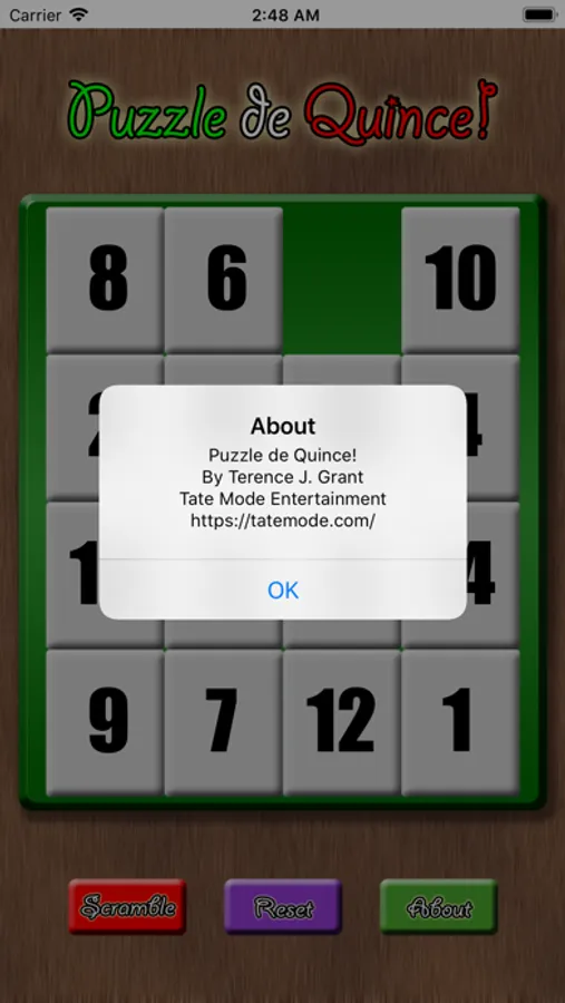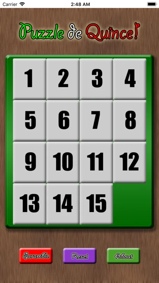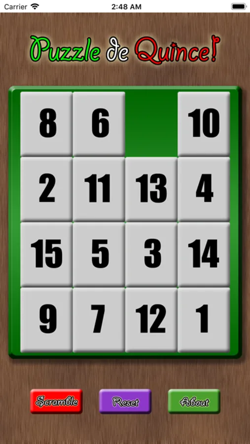 - Scramble button for a new puzzle, reset button to start over.