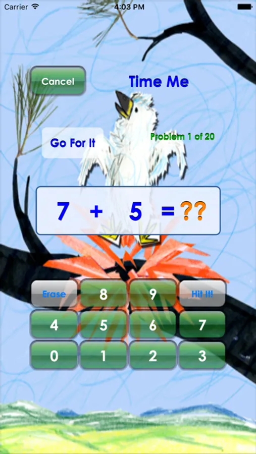 Pick the number of problems you want to do and hit Go. The app randomly presents problems based on your settings. When done, the app tells you how many you answered right the first time and the average number of seconds per problem. An Eagle Speed goal is 3 seconds per problem; and Eaglet Speed goal is 5 seconds per problem. You can then choose to redo problems that were slower than Eaglet Speed. Time Me is also the practice area where you perform the All Facts Challenges.