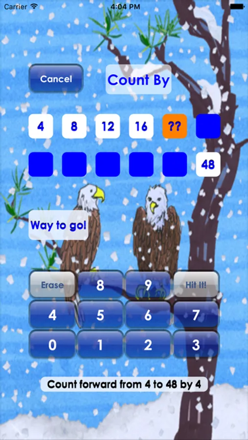 Pick a number to count by from 0 to 12. The app gives you the first and twelfth number and you need to fill in the rest. You can choose to count forward or backward. For example, if you pick to count forward by 3, the app gives you 3 as the first number, 36 as the twelfth number, and you need to fill in 6, 9, 12, etc. When you are done, the app tells you how many you answered right the first time and the average time it took to do each answer. Eagle Speed is 3 seconds or less, Eaglet Speed is 5 seconds or less.