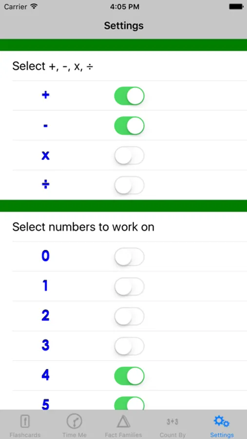 The app selects a Fact Family based on your settings and presents all problems in the family. For example, if the family for addition/subtraction is 3, 4, and 12, the problems presented are 3 + 4, 4 + 3, 12 - 4, and 12 - 3. Then the app moves on to another Fact Family. When you decide you are done, the app tells you how many you answered right the first time.