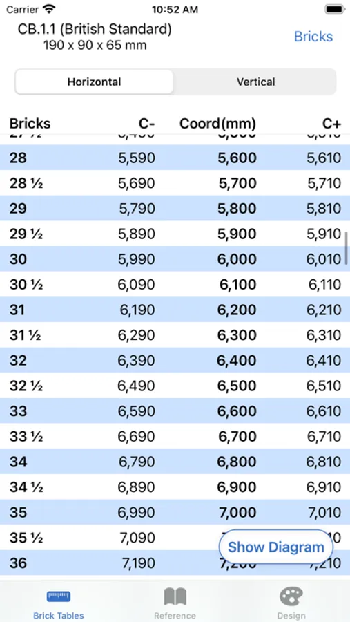Brick tables for horizontal and vertical dimensions are available with the full range of British Standard cuboid bricks, together with UK long bricks, international metric bricks and US modular imperial bricks including:
