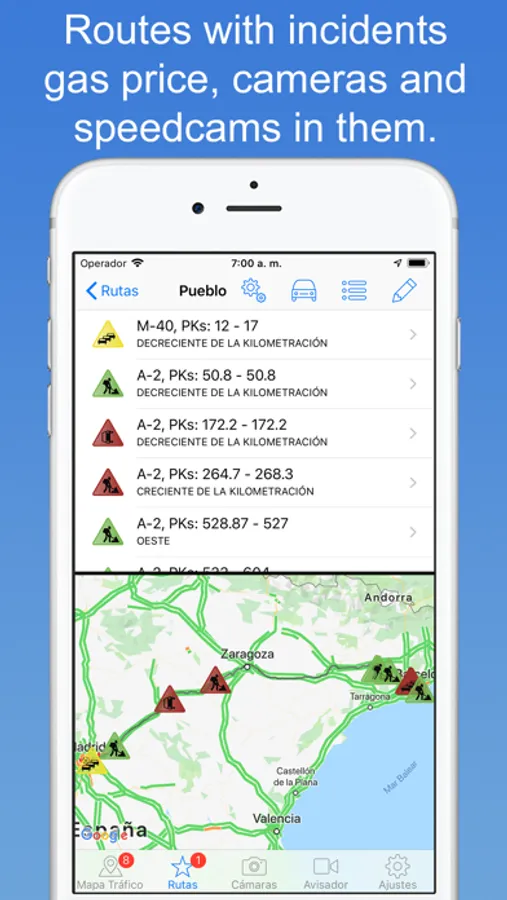 · Map with Google Traffic and incidents from DGT, SCT, Andorra and the town council of Zaragoza, apart from the incidents sent by the users of the app