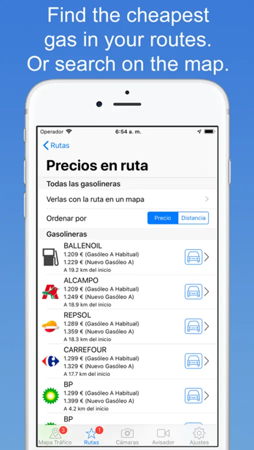 · Find gas stations on the “Traffic Map” (zoom in) or in “Routes” (they are ordered by price in each route you have created)