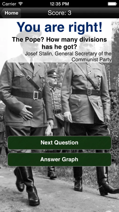 Test your knowledge of World War II history in this fun and exciting lite version of a history quiz written by a college history professor. Die-hard history buffs and those looking to learn more about World War II will will delight in this challenging app. How much do you know about the battles, generals, statesmen, and weapons of World War II?