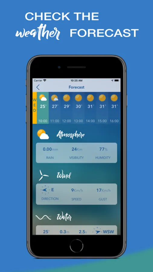 - FORECAST, with hourly reports for temperature, sky conditions, water temperature, swell (wave height, period and direction), and wind (speed, direction, gusts). And daily reports for tides and astronomy data (sunrise, sunset, moonrise and moonset).