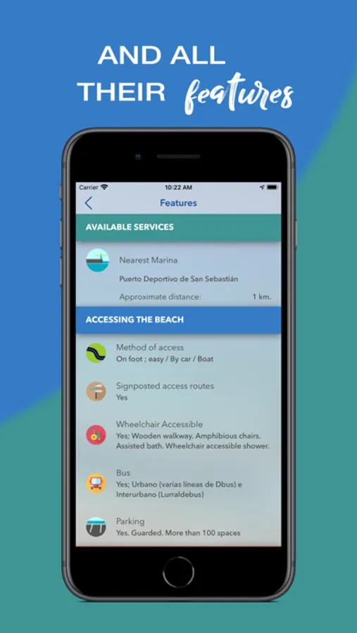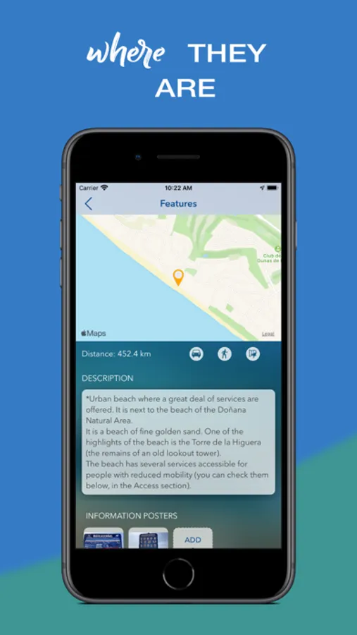 - FEATURES includes a map showing the location of the beach and the distance from your current location (with the possibility of calculating the route to the beach by car or on foot, or launching the Maps app to get navigation). This section also includes a brief description of the beach, a list of general features (length, width, type of sand, etc.), a list of the main services available at the beach (showers, toilets, sports areas, etc.), info about accessing the beach and safety info. Moreover, it includes a new image gallery with information posters found at the beach. You can contribute your own photos to this gallery.