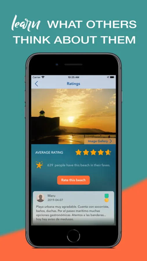 - RATINGS, which shows ratings, reviews and photos of the beach shared by users of the app. This is the section you can help grow by rating the beaches you know, writing reviews or uploading photos to share them with other users. (In order to send your ratings you must first login to your iPlaya account. Registering is super quick and easy!).