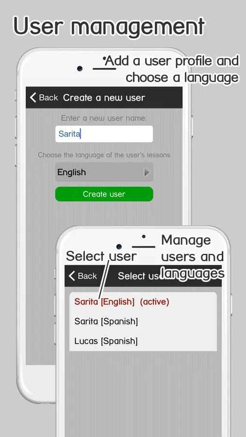 • Option to create two user profiles, one in each language, so a single child can use the program in both languages.