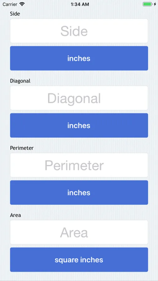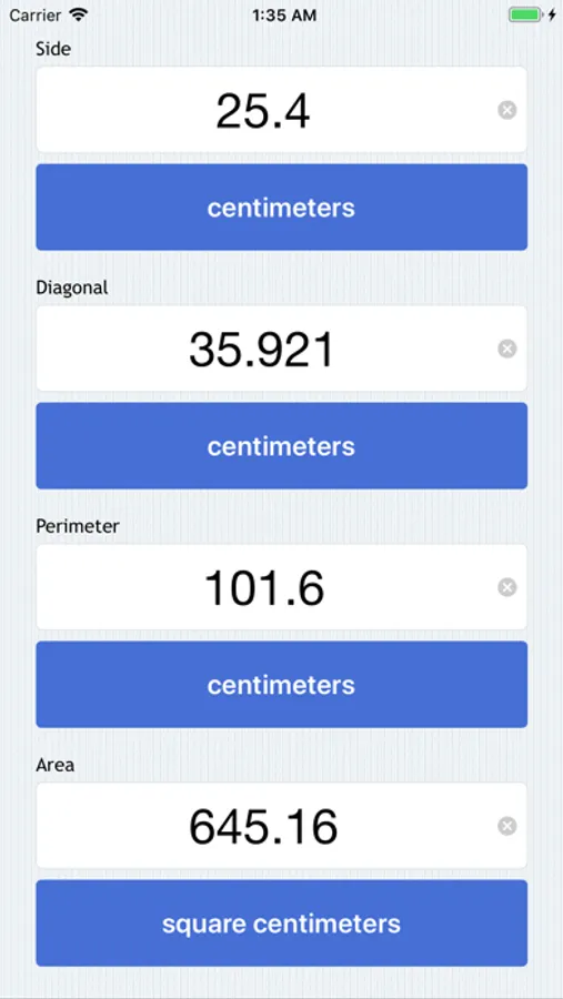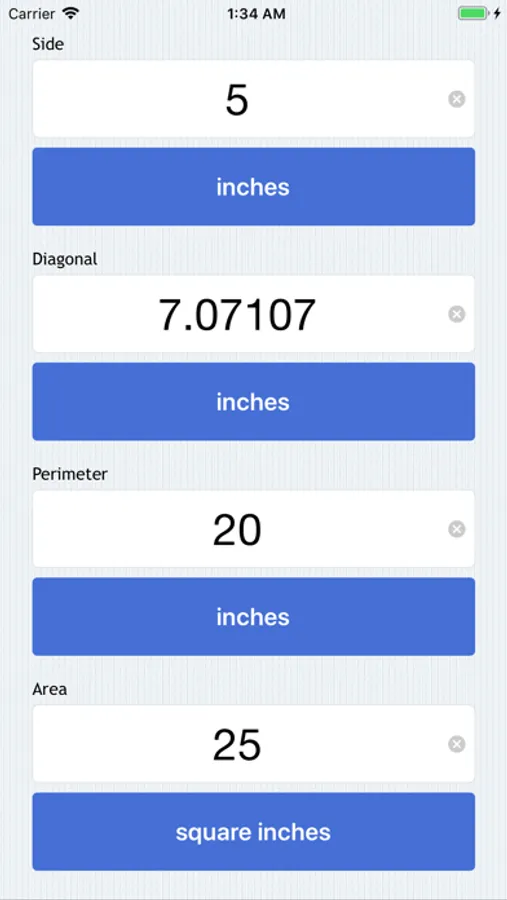 Square Calculator allows you to calculate side, diagonal, perimeter, and area given any value.