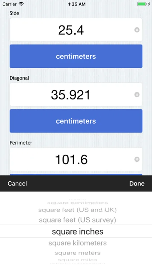 For example, this square calculator allows you to quickly answer questions such as: The side of a square is 5 inches. What is the area in square meters? (0.016129 m^2)