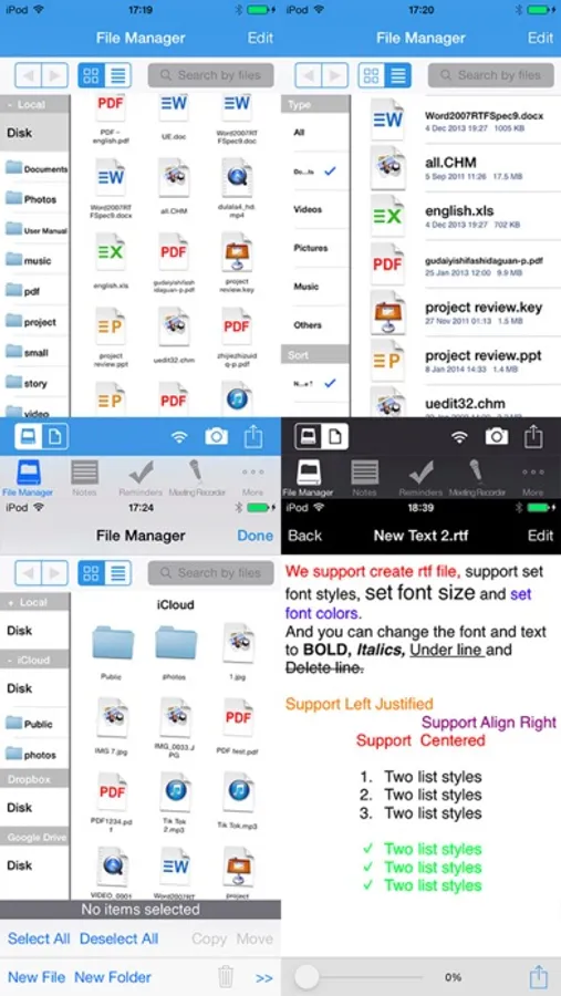 (1) Support the iCloud Drive,Dropbox. cloud files can easily interact with the local documentation and supports online reading in the cloud