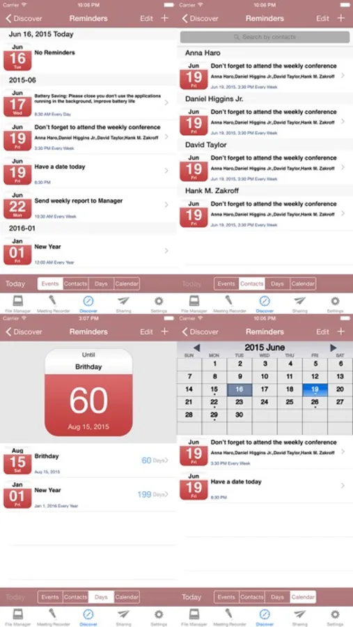 - Reminder could be set up with memo, date, repeat frequency, beeps and contacts.