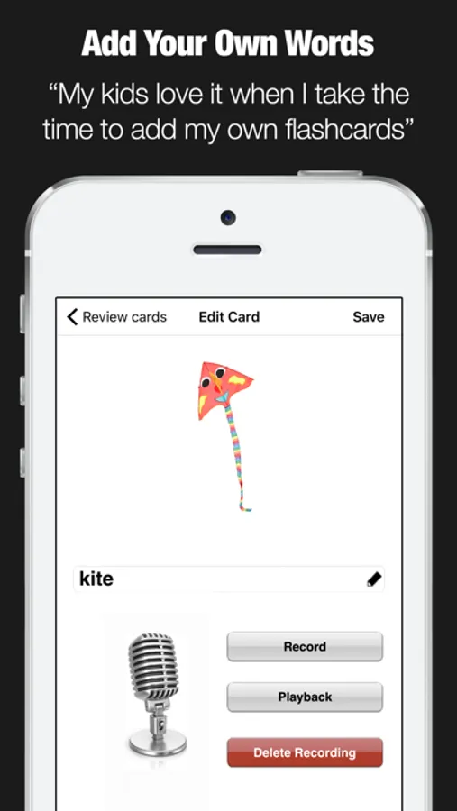 "Must-have app! My daughter (23 months) loves the flashcards with the sounds as my wife and I have recorded our voices with the sounds each animal makes! Outstanding as whenever we ask our daughter if she wants to do words, she laughs and screams Yes! Keep up the excellent work and we look forward to more outstanding products!"