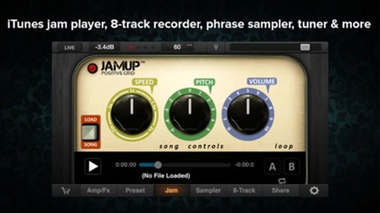Import songs from your iTunes library to jam along with using the Jam Player module. Adjust the tempo and pitch with the high-fidelity time-stretching engine. Easily record and layer looped parts with the sound-on-sound phrase sampler. With the built-in tuner and metronome, and optional 8-track recorder, JamUp delivers a complete, professional processing and recording solution.