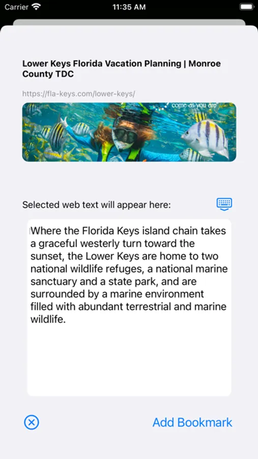 URL Manager Pro is a bookmark manager for the web and includes a share extension. While surfing the web using Safari or another web browser, you can bookmark the web page using the Share button and then add the bookmark to URL Manager Pro. Any selected text on the web page, will be automatically copied to the note field of the bookmark. If you want to add a note, that is also possible.