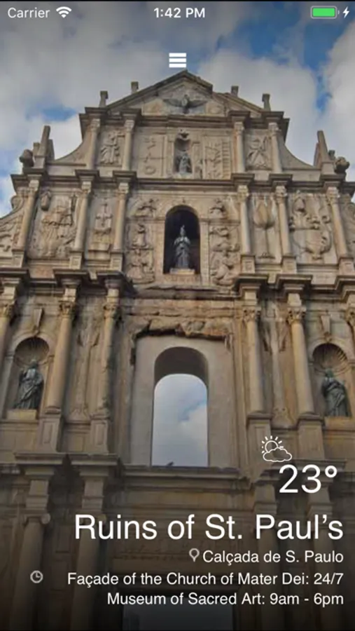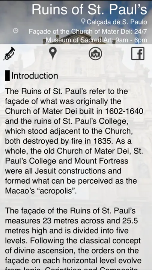 •The app provides both online and offline modes. The online mode provides users with the most up-to-date news and information about activities and allows them to use the route guide and share function, while the offline mode provides users with extensive information about the World Heritage sites and various other spots in Macao.