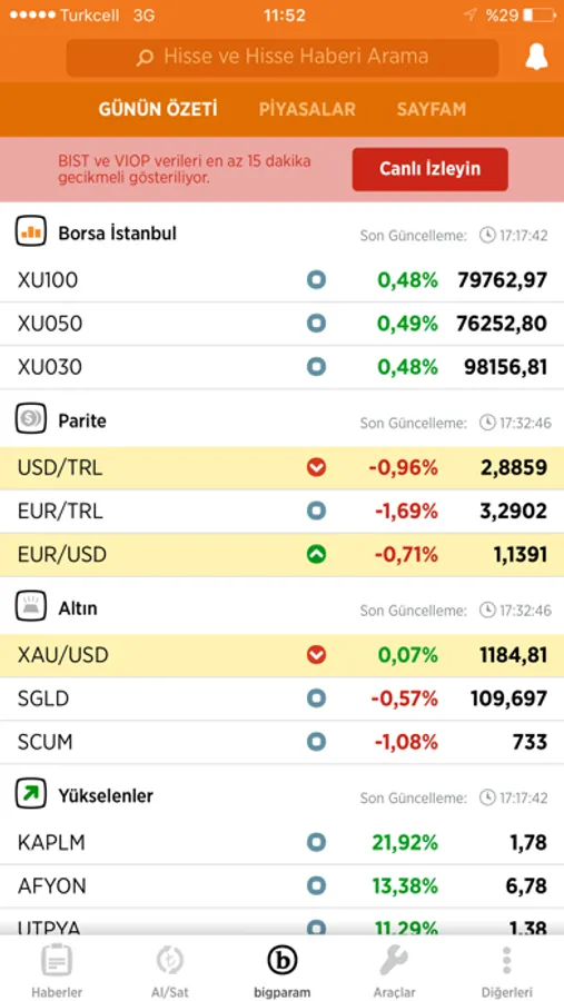 Finans dünyasını yakından takip etmek, portföy yönetimini kolayca yapmak artık çok daha kolay! Dolar, Euro, gram altın fiyatları anlık olarak yanınızda. Portföyünüzdeki hisse senedi listesini bigpara mobil uygulamasına tanımlayarak yatırımlarınızı kolayca şekillendirebilirsiniz.