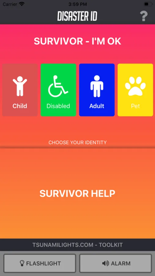 Try the updated version of the Disaster ID app called Visual 911+ app. Visual 911+ not only turns your screen into a visual signaling device, but if networks are up an running it also transmits your general GPS location to your family/friends via email when you activate an "Alert" status, including "I'm Safe".