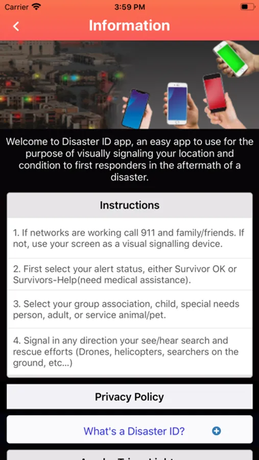 When a disaster has struck during the night or under adverse conditions (ex. blacked out building), activate your Disaster ID app to help responders visually identify/locate you faster. The color code follows: