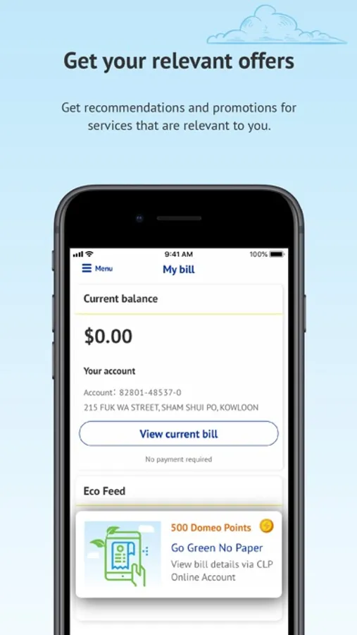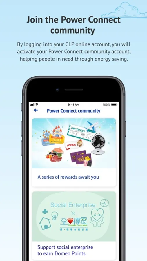 Enjoy a full array of eServices in the CLP mobile app to experience our personalised e-Journey. Just one app allows you to view eBills, make Mobile Payments, join the Power Connect activities, shopping at Domeo eShop, and set up a new electricity account with the Move-in service. You can also earn Eco Points and rewards when you register for each eService. Download the CLP App and enjoy the ease of e-living today!