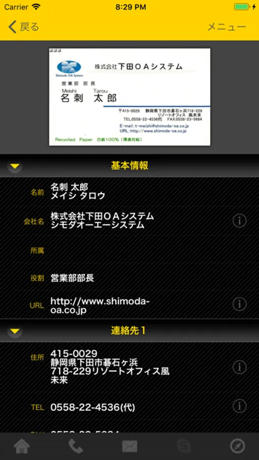 連携機能(URL・会社名Web検索・電話発信・メール送信・Skype起動・Googleマップ連携)が利用できます。