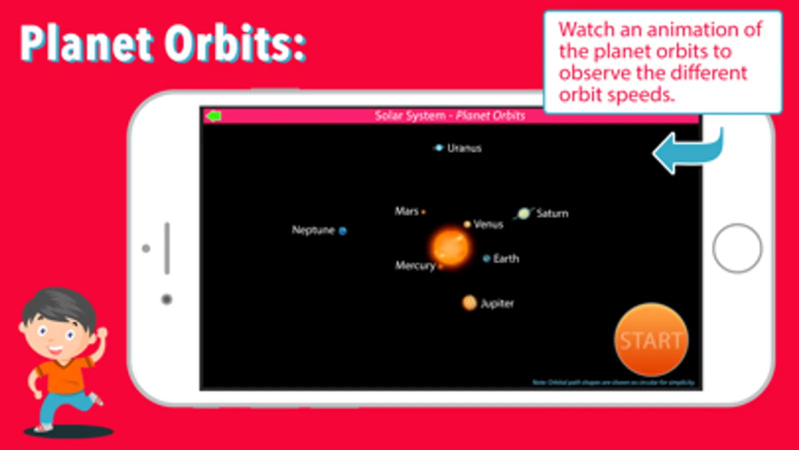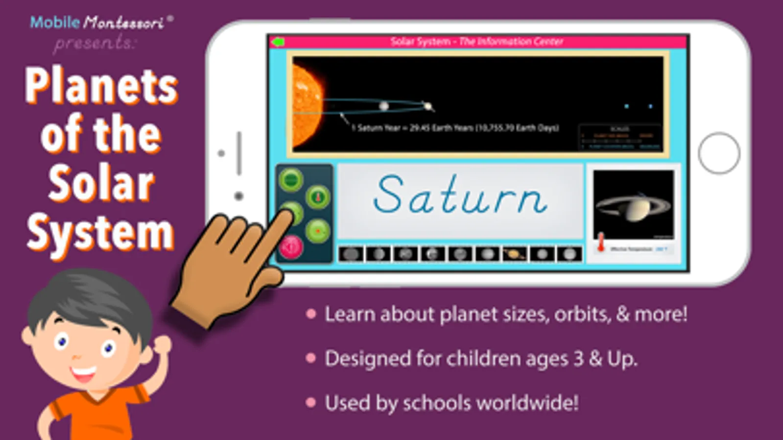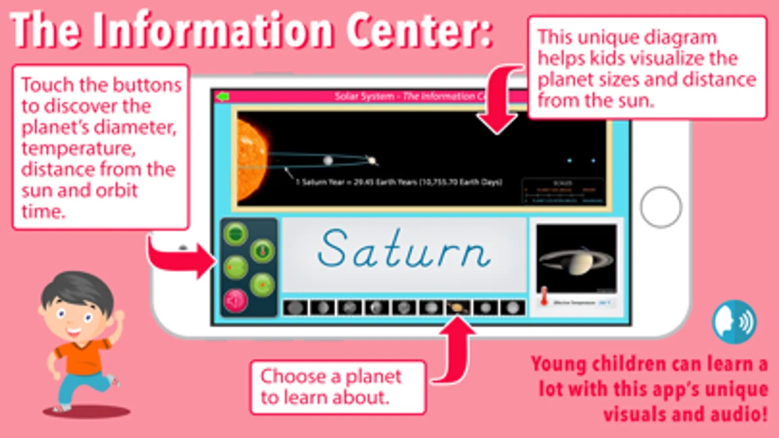 In a simple way, the app teaches children about each planet's location, size, orbit time, temperature, composition, and more.