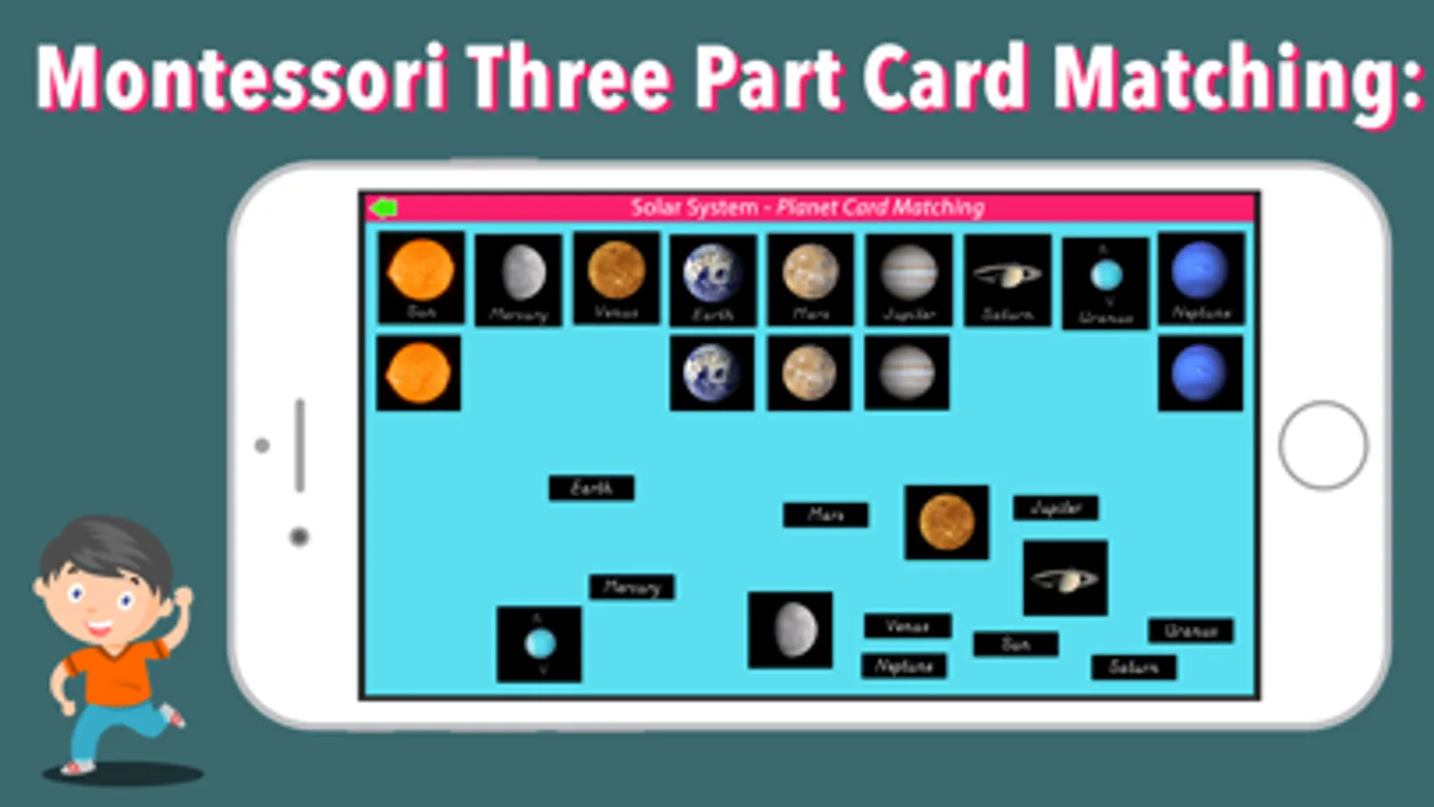 The Planet Card Matching activity contains the famous Three-Part Card System used in Montessori Classrooms. Children can drag the picture cards and labels to match them up to the control cards at the top.