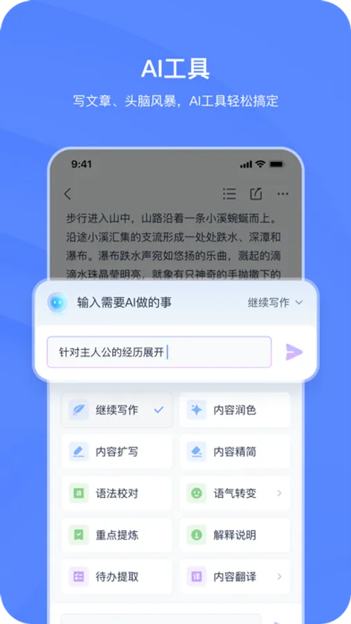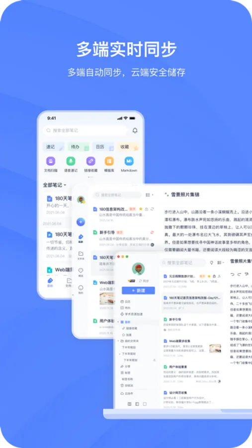 AI工具赋能内容创作,写作、脑暴、润色、提炼、翻译等一键搞定,让工作学习效率倍增。免费3G存储空间,多端实时同步,支持在APP、小程序和电脑端查看、编辑和分享笔记。