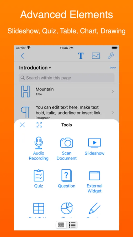 * Besides title, paragraph, photos, videos, audio recording, markdown, and other basic elements, CBB offers a lot of powerful widgets: Read Aloud, Quiz, Slideshow, Table, Chart, Question, Equation (LaTeX), Drawing, Shapes, Checklist, Expandable Content, Screen Recording, Panorama, 360 Degree Image, QR Code, Online Image, Online Video, YouTube Video.