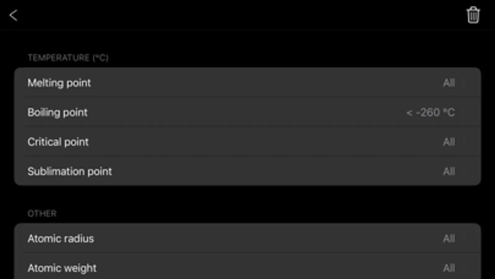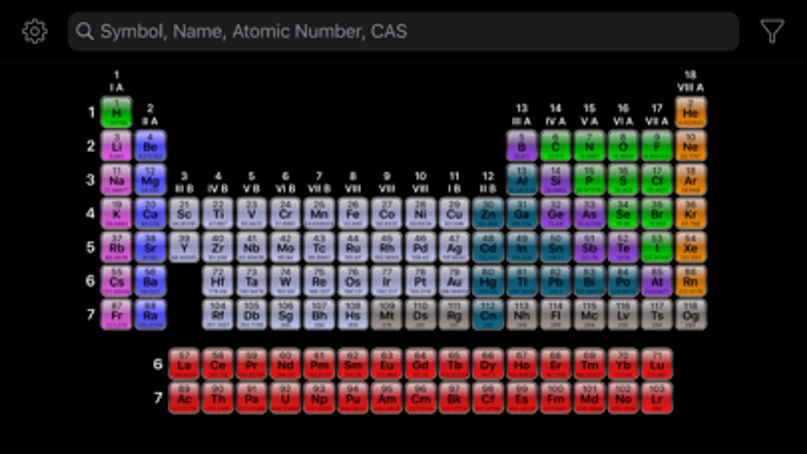 Periodic Table+ is universal interactive periodic table with advanced filtering of elements (you can set your own filter and you will get group of elements which matches all of your conditions) Periodic table supports 6 languages (English, Czech, German, Spanish, French and Italian) and 3 temperature units (Celsius, Kelvin, Fahrenheit).