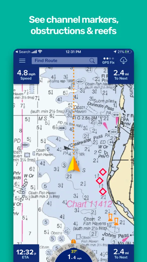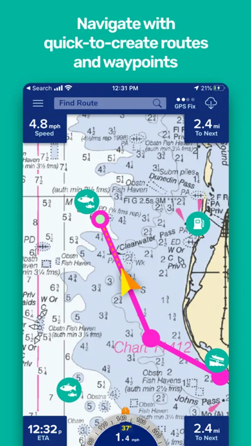 • Fully indexed point of interest (POI) database including weather, aids to navigation (markers and lights), obstructions, tides, currents, your buddies, and more.