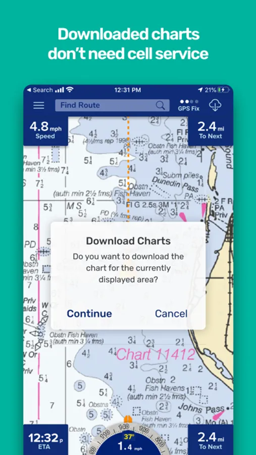 NOTE: Continued use of GPS running in the background can dramatically decrease battery life. Though PRO CHARTS™ will function without a GPS as a chart reader, a GPS-enabled device is required for point-to-point navigation. Third-party Bluetooth GPS units are available to enable GPS for iOS devices such as WiFi-only iPads that do not include a GPS receiver. For offline use where no Internet connection is available, charts must be pre-cached while still on-line and connected, any charts downloaded while online will be available for offline use.