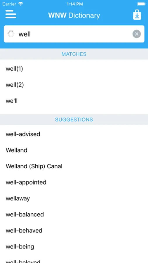• Search autocomplete helps you find words quickly by displaying predictions as you type.