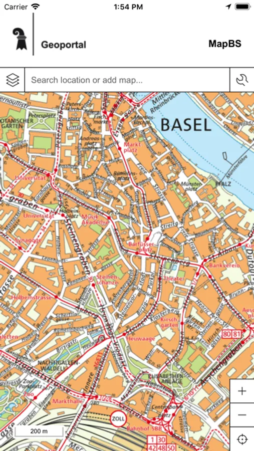 Der Basel Stadtplan zeigt neben dem offiziellen Stadtplan des Kantons Basel-Stadt, viele weitere aktuelle und genaue Geodaten, Karten und Geoinformation der kantonalen Verwaltung. Der Kartenviewer umfasst über 25 verschiedene Themen mit insgesamt mehr als 100 zuschaltbaren Ebenen. Die mobile Version beinhaltet einen leicht reduzierten Inhalt der Standardversion. Die Standardversion kann unter map.geo.bs.ch gratis genutzt werden.