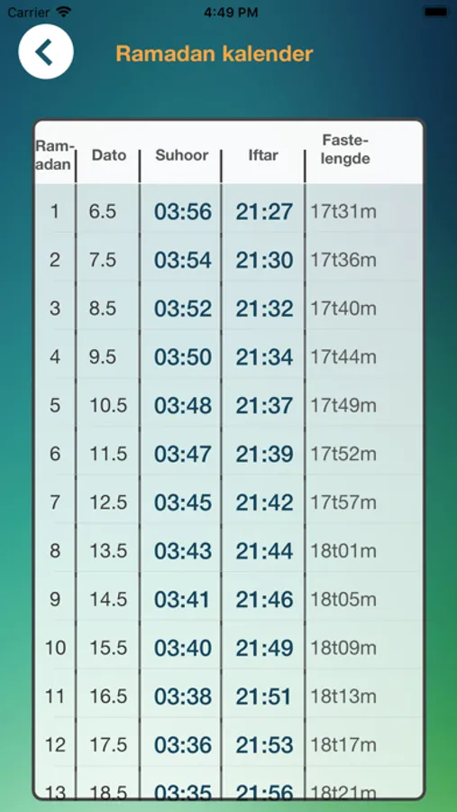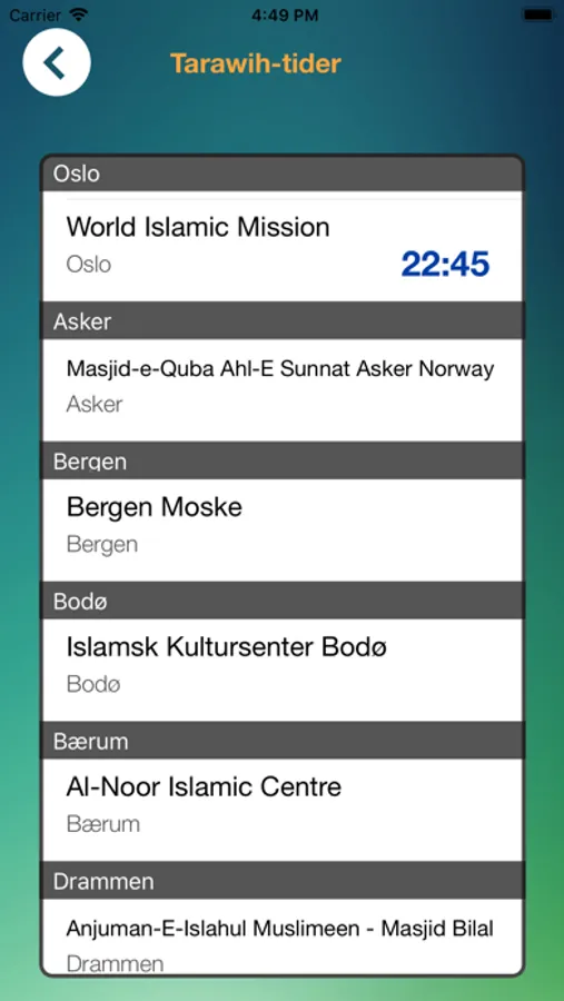 - Den viser bønnetider fra 50 byer i Norge.