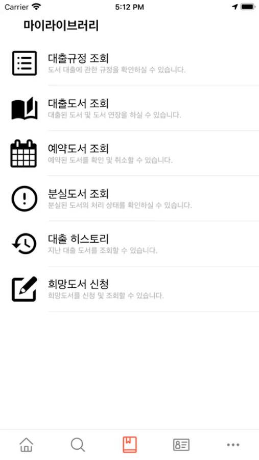 - 카메라: 도서 ISBN 바코드 인식 및 이용자 사진 정보 개인화 기능 제공