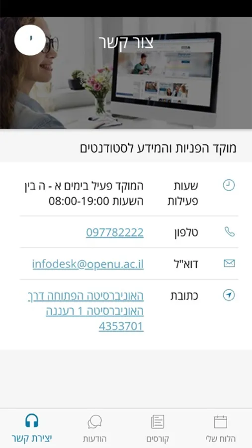 האפליקציה של הסטודנטים באוניברסיטה הפתוחה: כל המידע על הקורסים והלימודים שלך. אפשר לצפות בלוח המפגשים שלך להיום, לשבוע הקרוב או לסמסטר, להתעדכן בלוח המטלות, בציונים ובעוד הודעות חשובות, לראות את רשימת חברי הסגל בקורס ואת מאזן התשלומים, וכמובן ליצור קשר עם האוניברסיטה