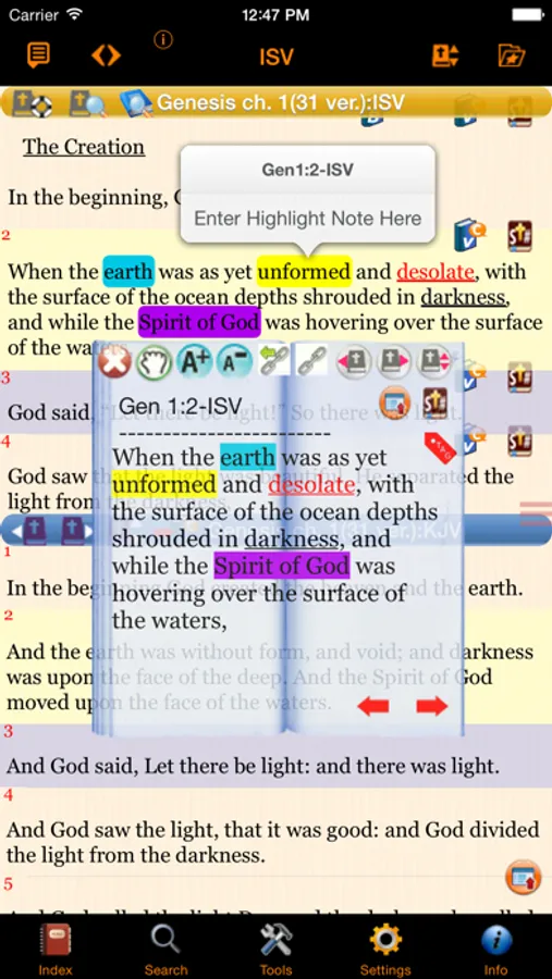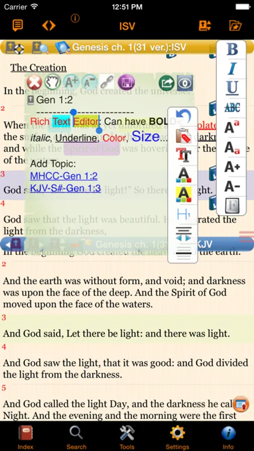 * Powerful note(have both scripture and topical "Tag" notes) editing - the only app to allow "rich text editing" and add links to any bible study content within the app - supports "rich text editing" including "Bold", "Italic", "Underline", "Strike Through", "Font color/highlight/size", "Ordered or unordered list", etc. In addition, you can insert "Tag" shortcut that links any bible study content to your note. Also, you can copy web page link and paste into your note. Video demo: http://facebook.com/handybible