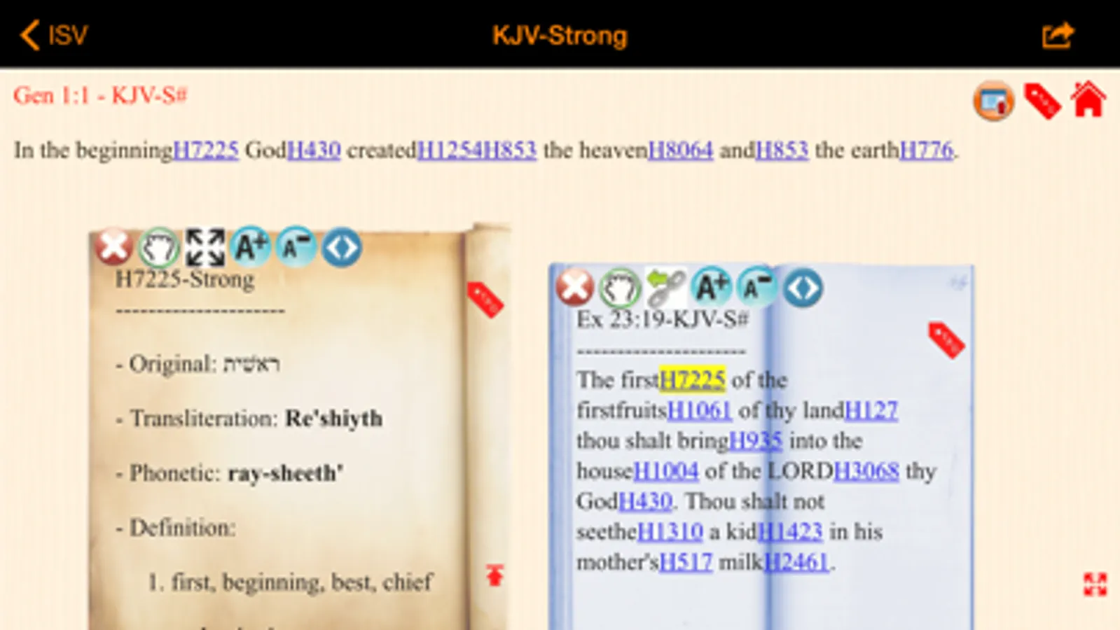 * Bible with Strong Number: includes KJV with Strong Number text. For each Strong Number, can have a floating window to show its definition.